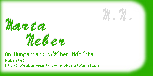 Frequency of MARTA name and NEBER surname in HungaryThe Marta name frequency in Hungary: The name is in TOP Twenty-Four most common woman name in Hungary. As 1.st name: 0.5098% (Fifty Thousand Nine Hundred and Seventy-Five), as 2nd name: 0.107% (Ten Thousand Seven Hundred and Four) woman have this name.. Neber surname frequency: 13 What English words can be put together from characters of the name?